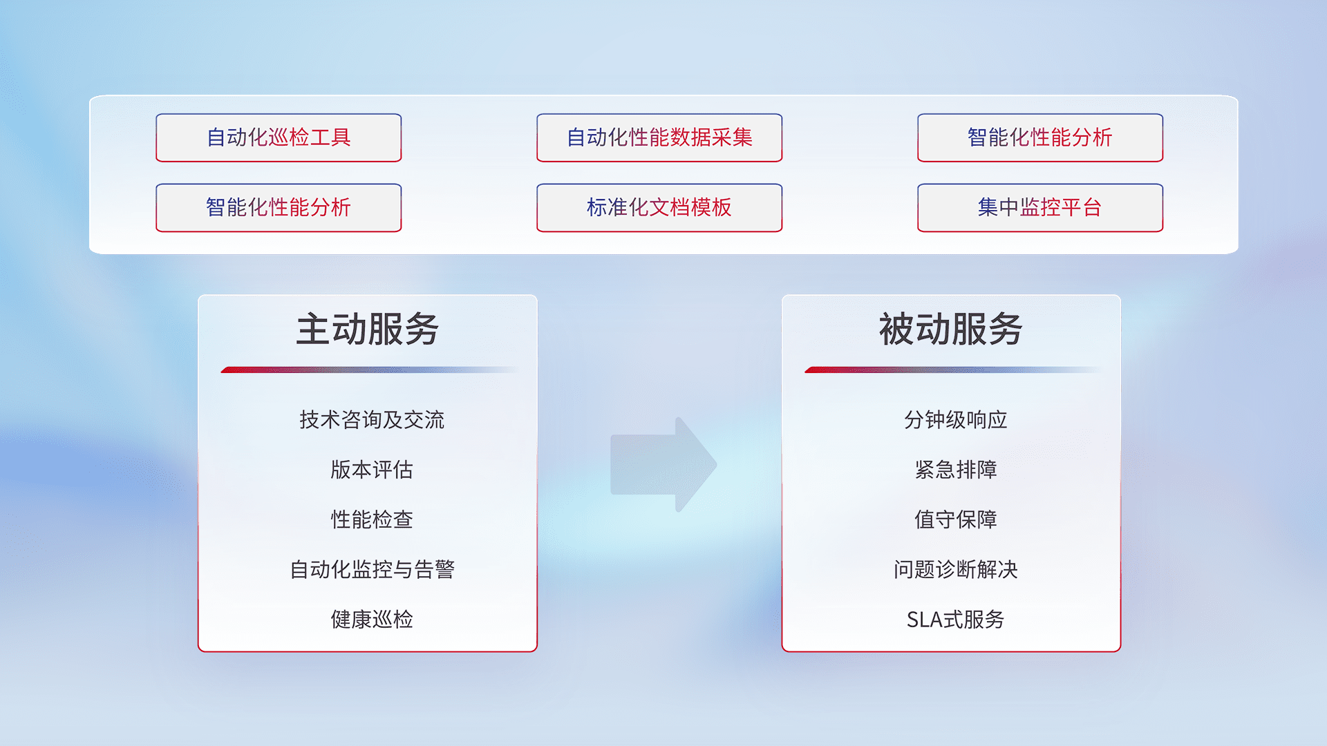 智能化工具和标准化文档,,,,保障服务质量,,,提供主动服务(包含技术咨询、、、、版本评估、、、、性能检查、、、、自动化监控与告警、、、健康巡检)和被动服务包含(分钟级响应、、、、紧急排障、、值守保障、、、问题诊断解决、、SLA服务)。。。。